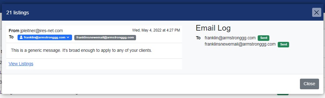 By clicking on the Alert, you can view the Alert details and a snapshot of the email that was sent. This snapshot includes the date and time the original email attempted to send, the message content, and a link directing you to the listings, contracts, draft, report, or business opportunity. Based on the message found inside the question mark icon, you likely need to reach out to your client to correct an email address or let them know that the email was rejected by their mail program. Alerts allow you to proactively reach out to your clients and ensure they are receiving all the IRESis.com information they expect from you.