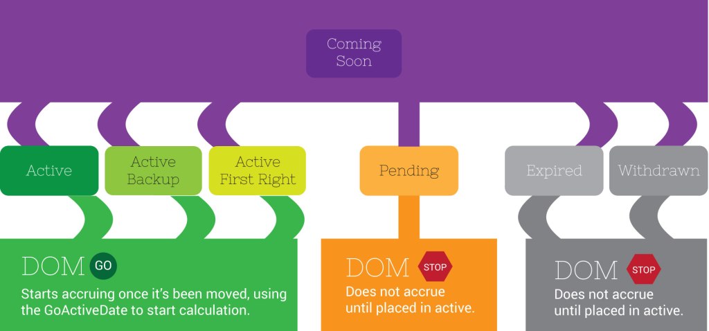 Starting mid-December, all listings will have their DOM calculated based on the First Active Date. Prior to this change, the DOM was calculated differently for listings that started life as Coming Soon as opposed to Active. First Active Date is the first day that a listing is in an Active status.