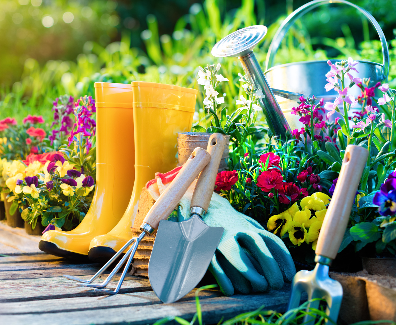Previous Image Next Image Gardening – Equipment Flowerbed In Sunny Garden Set Of Tools For Gardener And Flowerpots In Garden