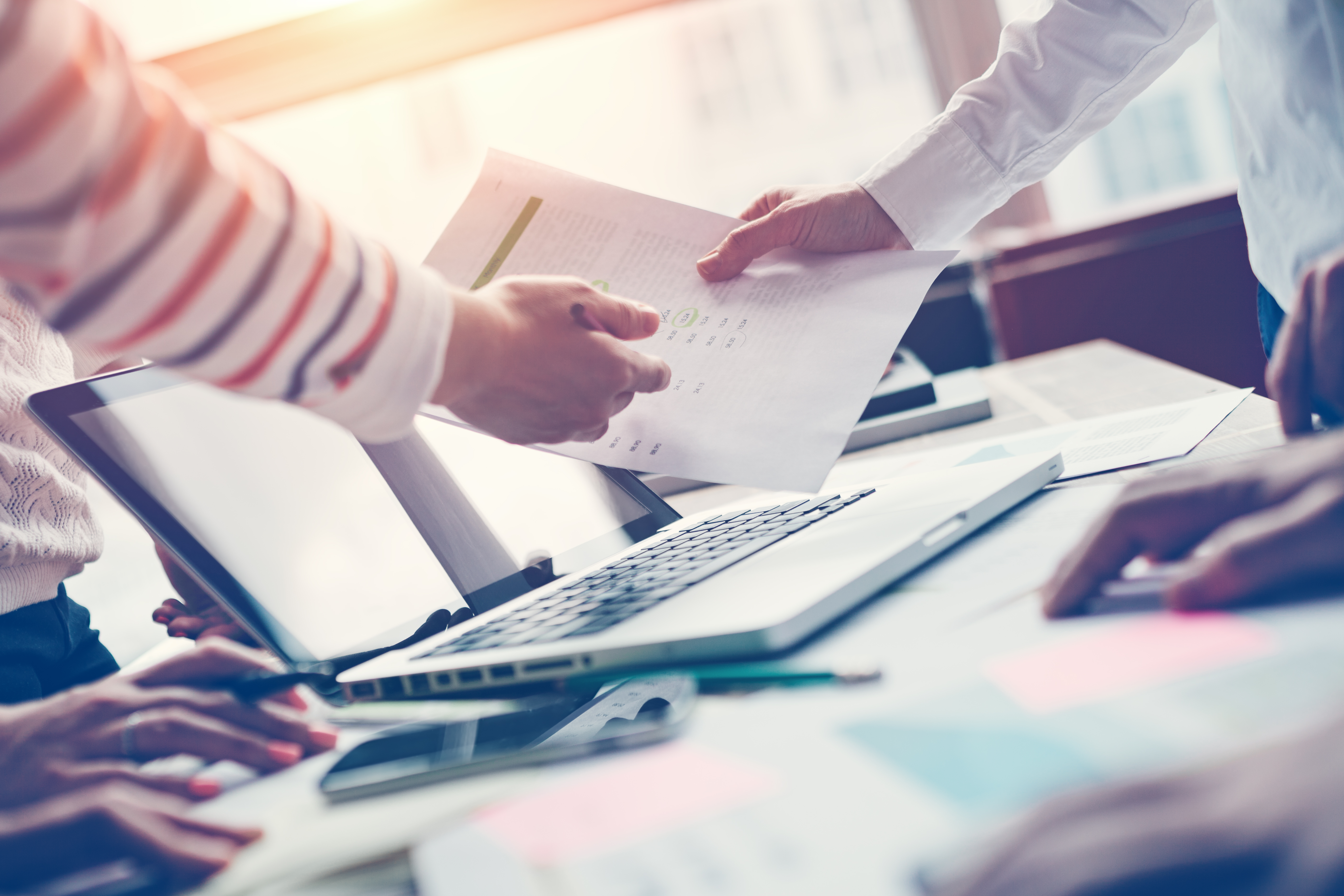 Project meeting. Team discussing new digital plan. Laptop and paperwork in office. Intentional sun glare